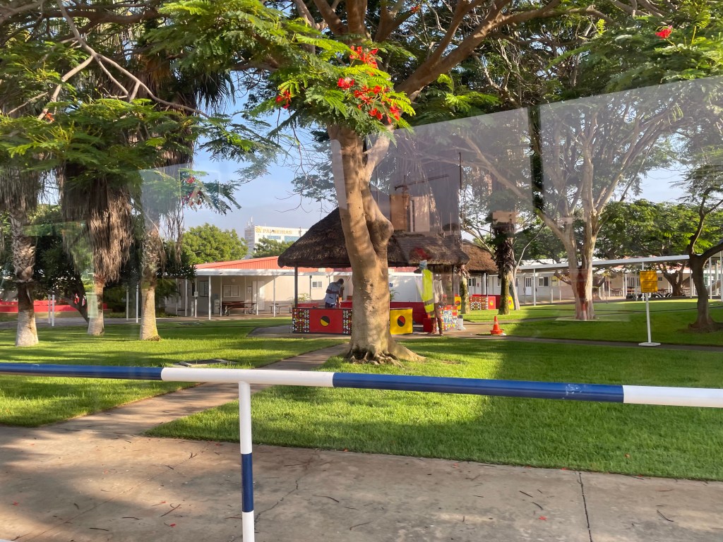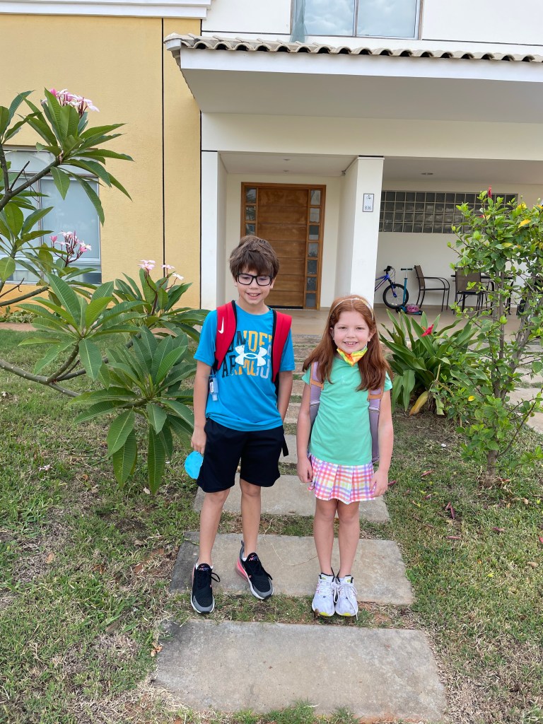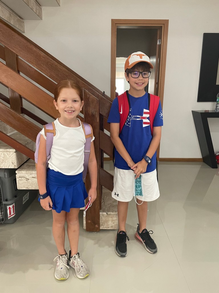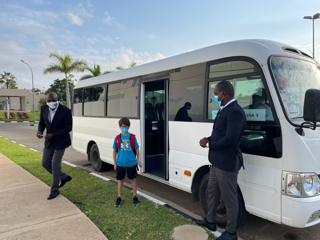 Monday was a big day! The kids went to their first day of face to face schooling at Luanda International School. Here, Hudson is in Year 5 (4th grade) and Lucy is in Year 2 (1st grade). There are two classes for each grade. Luckily, Hudson and Lucy met kids in our neighborhood (compound… I’m not entirely sure what to call it), that are in their classes so while there were normal first day jitters they weren’t as bad as I was expecting. There are four buses that take kids ages 3 – 18 from Monte Belo, where we live, to the school. These aren’t regular school buses. Below is a picture of Hudson by the bus. There is a bus parent on each bus. The woman who organizes bus duty is a saint. She prints out a student checklist for each bus everyday and the entire process is very efficient. I love efficiency. The kids came home and reported they had a great day at school which was so wonderful to hear! The school is a lot of one story buildings on a lush and green campus so they keep saying how big the school is. They also have Portuguese, singing, visual arts, performing arts, PE and swimming classes in addition to their regular courses.
