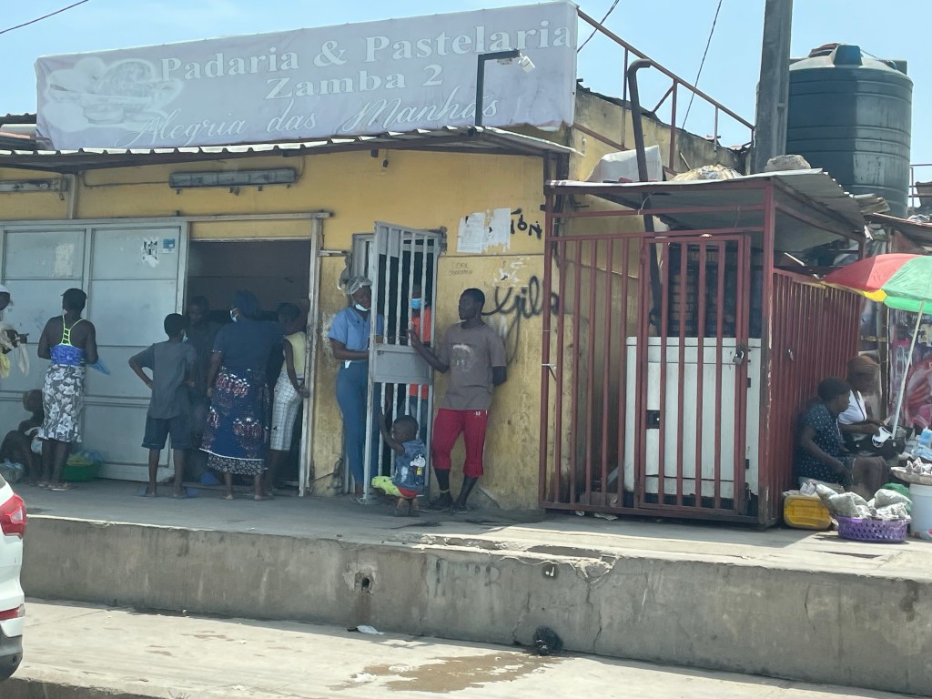 This week I had to buy a local SIM card so I can have an Angolan phone number. I had to go to the school and pick up my access badge. I set up our water delivery. We bought a water cooler from someone who is leaving Angola soon, but we needed to set up the water jug delivery. Emerson, our driver (who I will tell you more about later, but the short story is we adore him), drove me to Saudabel, the water company. When we pulled up I was so confused because I didn’t see a building. It turns out this wall (photo below) opens up and you drive through. They then close the wall and the buildings, warehouse, etc are all behind it. Saudebel is closer to downtown and therefore there are more people on the streets. Usually Emerson will ask if I want him to come with me into the store. This time he didn’t ask. He just got out and walked me through “the wall.”