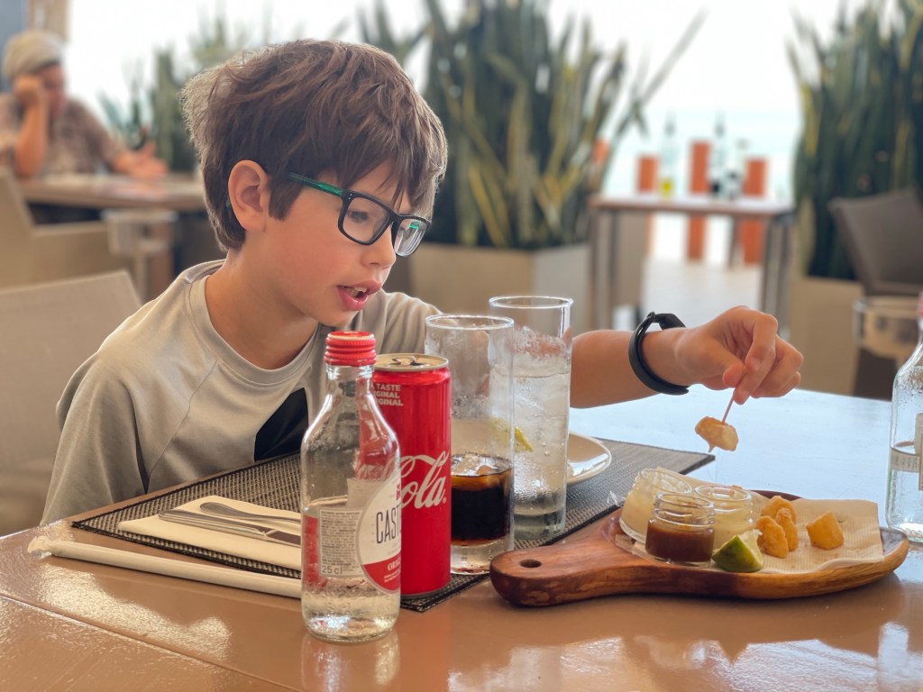 We were all so hungry that as soon as Keith left we headed out the door to eat. It was a short walk (like two minutes!) to beachfront where there are tons of restaurants. We ended up at Surf Shack. Hudson was incredibly hangry. He wasn’t all that impressed with his airplane lunch and when I thought about it he hadn’t had a snack all afternoon. We ordered calamari as soon as we sat down. Note to self – make Hudson eat while traveling. The kids had pizza. I’ve mentioned the meat in Luanda isn’t the best. Apparently the kids have noticed and missed it because they ordered a bacon and pepperoni pizza. I had grilled fish and Jordan had an ahi tuna burger. The food was good, but we were so hungry that I’m sure anything at that point would have been great. The sunset was gorgeous and I sat there thankful the trip actually happened.