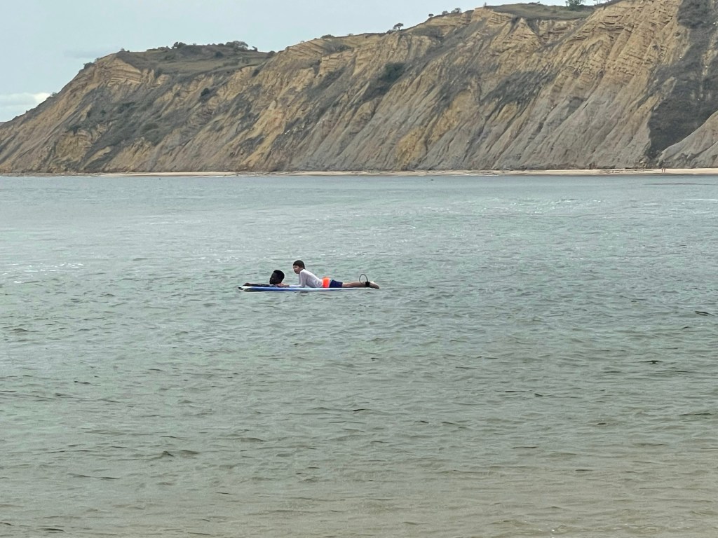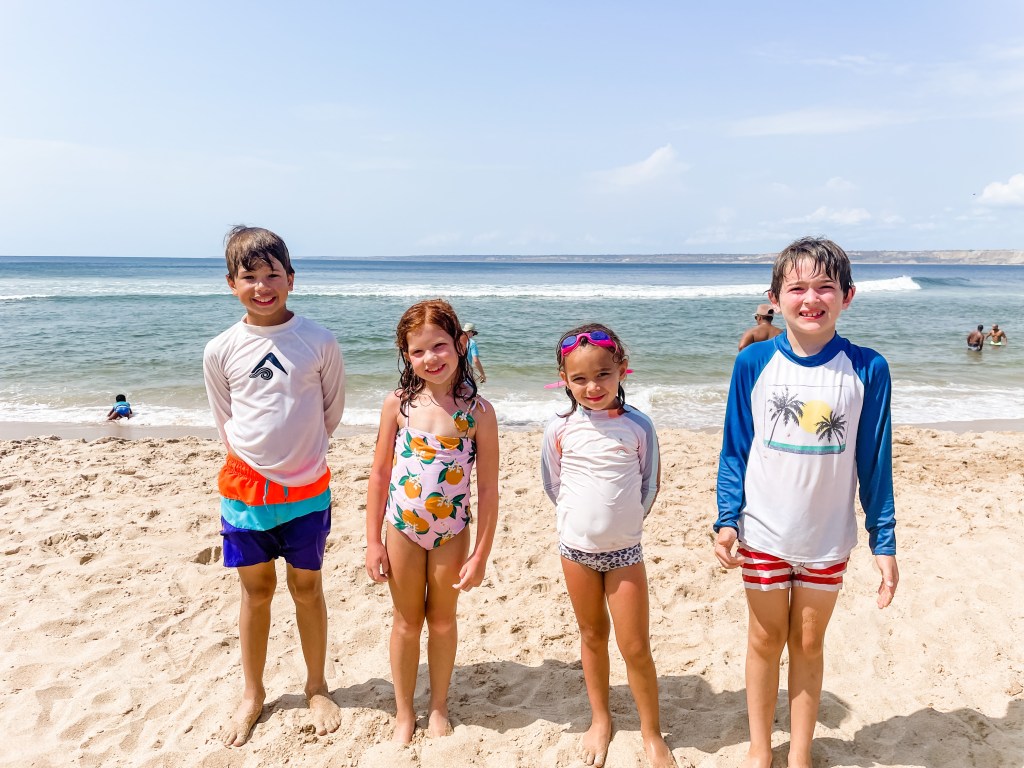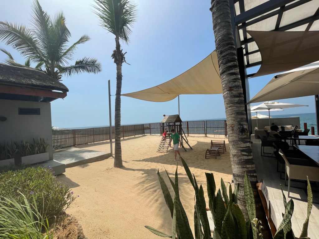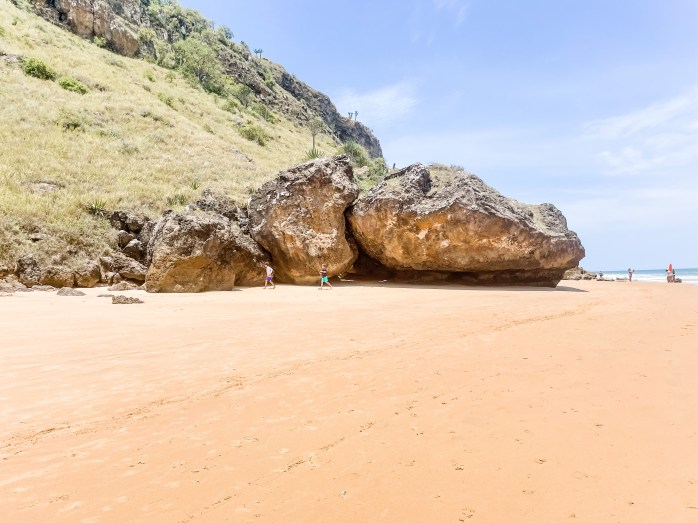 Saturday, we met up with several other families around 8 am and headed to Cabo Ledo. Cabo Ledo is roughly 2 hours south of Luanda and the drive was beautiful. We first went to Praia dos Surfistas (Surfer’s Beach) and were amazed at how pretty and fun it looked. The sand isn’t white, but the water is crystal clear although a little chilly. Hudson also loved the large rocks on the beach and found a few “caves” he and his friend, Lucas, explored. There is a small restaurant you can order food and drinks from as well as cabanas you can rent for the day. They also provide surfing lessons (Hudson said he wants to do it next time!) for about $14/hour. The surfing looked like fun. I might even try it next time we are there. We stayed for about an hour and then headed to our reservations for lunch at a resort, Carpe Diem, nearby. We estimated it was about 15 minute walk (maybe 25 with kids), so we sent the gear with the drivers and started walking. The walk ended up being more like 35-40 minutes, but it was enjoyable. The restaurant has plenty of room for the kids to play and the beach was close by. The parents took turns watching the kids when they were in the water. While the food at the restaurant was delicious, the service was inconsistent. It took me 1.5 hours to get my first caipirinha and lunch overall took about 3.5 hours. It was ok as we weren’t really in a rush, but it did make for a long day. I think I would only go back to Carpe Diem if we had a reservation for the night there. If we were just going for the day I would stay at Praia dos Surfistas.