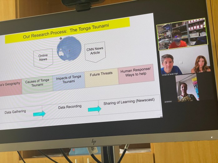 Both kids have made friends at school. Given it’s an international school, they have made friends from Angola, South Africa, Peru, Columbia, and California. On Thursday, Hudson’s class hosted a “Celebration of Learning.” In normal times (do we even know what those are anymore?), parents would attend these in person, but this was on Zoom. Hudson’s class had taken the subject of flooding and incorporated it into every subject. He read about flooding, did science experiments on flooding, somehow did math about flooding, and conducted research on flooding. He was broken into a small group of three and their focus was the recent volcanic explosion and tsunami that affected Tongo in early January. To show their knowledge they hosted a “newscast” during the zoom call. It was fun to see Hudson interact with his classmates.