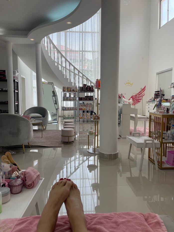 Friday, I ventured out to get my nails done. A neighbor had her nails done at a salon nearby, so I went to the same place. The location is interesting because it’s in a house, but most of the houses around it also were businesses. Another interesting thing is that the technicians did one foot and one hand at a time. In the states, they will clip the cuticles on one hand then clip the cuticles on the other. Not here. They focused on one hand and one foot at a time. I will say it was one of the more thorough pedicures I have ever gotten. The salon was nice and very affordable. In Luanda, it seems that goods are expensive, but labor is cheap which, I would assume, is problematic for the locals here. I met the owner, also named Sarah. I’m going back this week to get my hair done by a woman from Portugal.