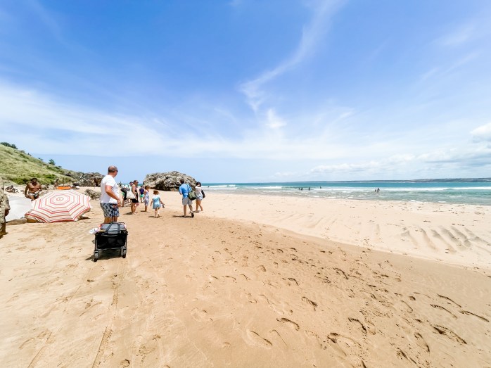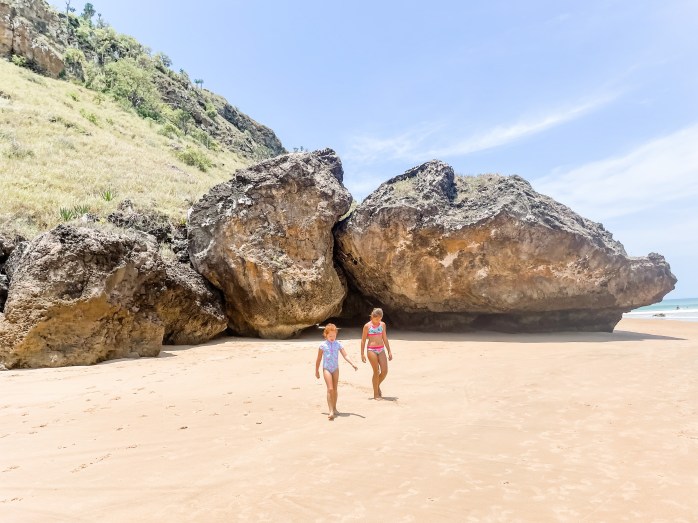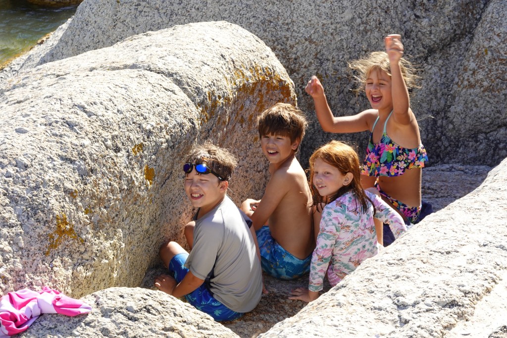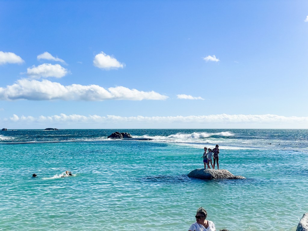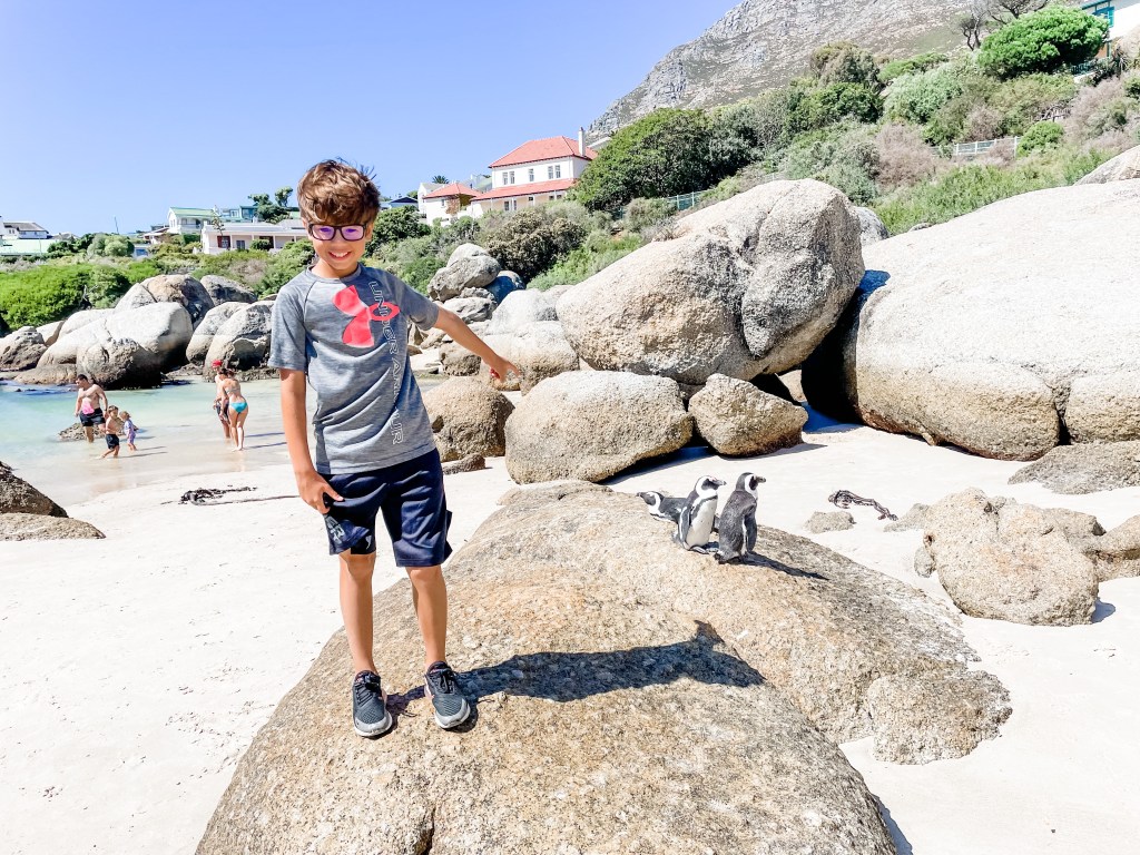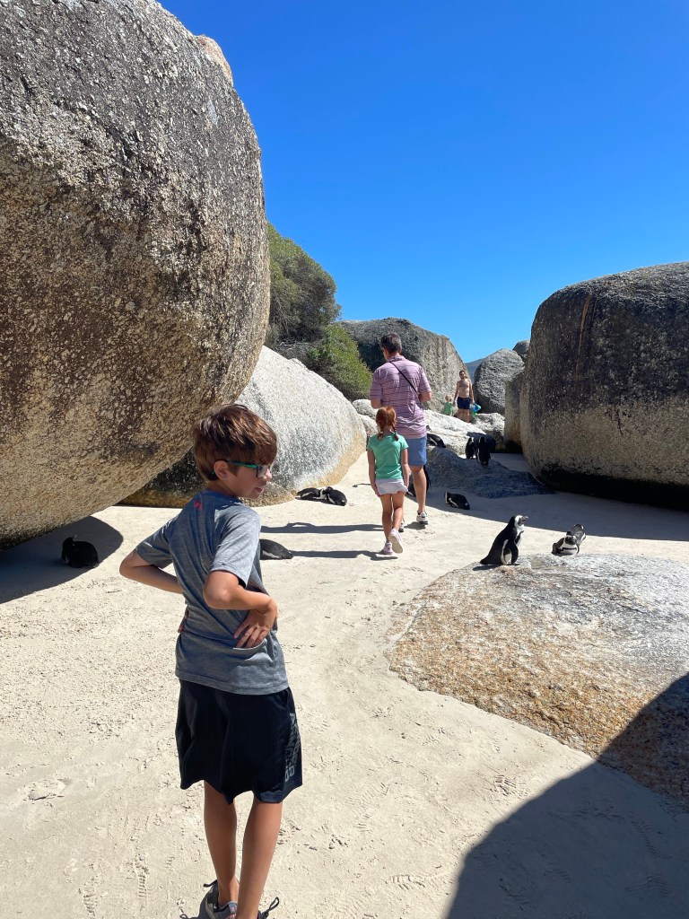We had been told that there are two ways to get to Boulder’s Beach. One is the boardwalk. The other, you go to a beach and then climb over a boulder (makes sense) and then you will be on the beach with the penguins. We opted to climb over the boulders. I underestimated how big these boulders would be. I had on a dress and sneakers that didn’t have much grip. We all managed to make it over and see the penguins. The penguins weren’t interested in us at all. It was kind of funny, but very cool to be walking around them. Of course, Hudson climbed every boulder that he could. Lucy also followed along.