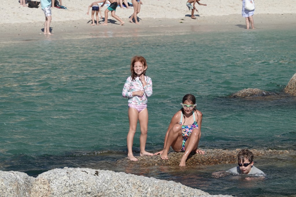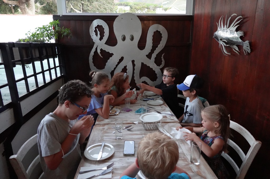 Our friends who are also in Cape Town mentioned they were at the beach so we quickly changed into our swimsuits and walked the two minutes to sand. The kids were elated to see friends and we were, too! The wind was too strong at the beach so we moved to a tidal pool nearby for a couple of hours. We all decided to go to dinner together at a nearby restaurant cleverly named The Codfather. The restaurant is also near our house so on the way home I stopped by and mentioned 13 of us would be coming for dinner. They told me they had an outdoor “terrace” that would fit us. I wouldn’t call it so much a “terrace” as a side porch, but it worked and the kids were contained.