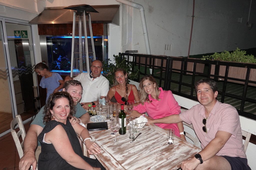 The Codfather has a conveyer belt of good sushi, but the highlight of the meal is that you go with your server to the fish counter to pick out the fish they will grill for you. Not only that, you watch them cut it and you then indicate if you want more or less. They had at least eight different types of fish. Three of the adults went to pick out the food and we chose tuna, salmon (hard and expensive to get in Luanda), king clip, seabass, and scallops. The food and service was great and the company was even better. I’m glad we were able to see our Luanda friends for a bit in Cape Town.