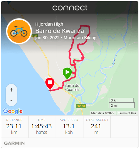 Jordan left about 6:30 am to go mountain biking on Sunday. He drove about an hour south of Luanda and then rode 23 km while ascending 241 km. He said it was very technical riding, but that he also found himself riding through a goat herd, private farms (the farmers didn’t care and came out to say hello), and saying hi to kids that came running after them. After the ride, the group went to a restaurant near the Kwanza river. He enjoyed himself and hopes to do at least a weekly mountain biking while we are here. He was also very tired and very red when he got home Sunday afternoon.