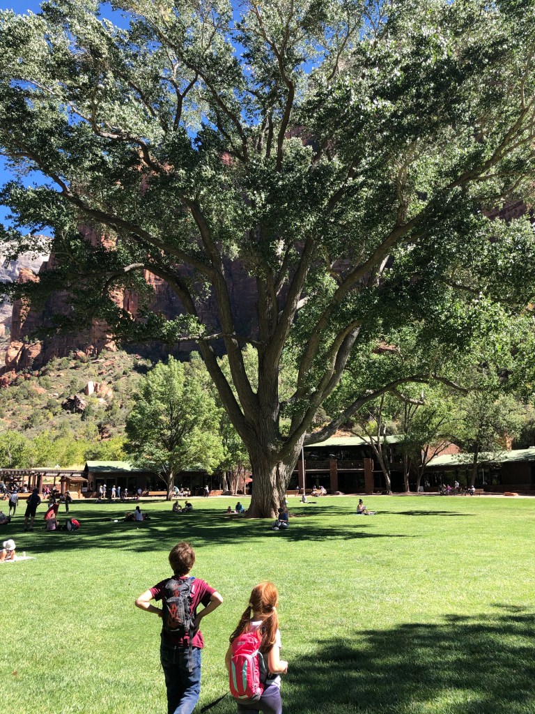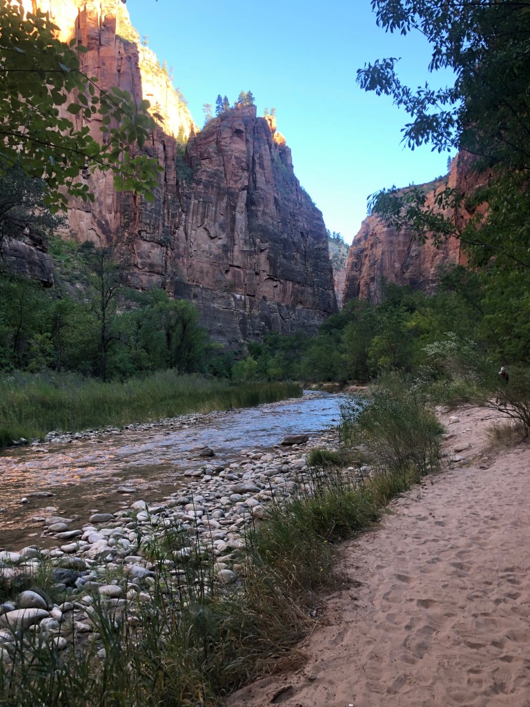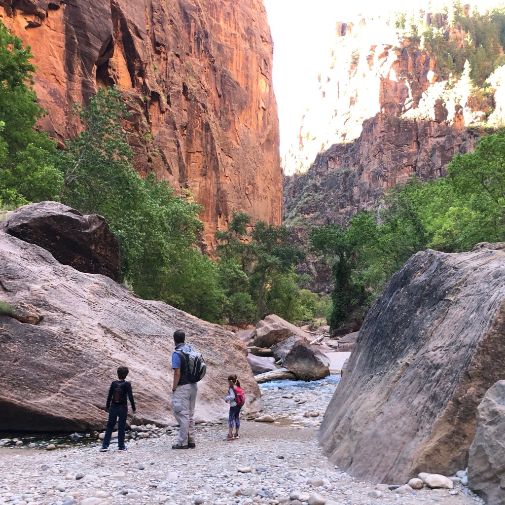 Our first stop was the Riverside Walk. This walk takes you along the Virgin River to the spot where hikers depart for the Narrows hike. The Narrows hike looks amazing and Jordan and I kept going back and forth as to whether or not we should do it with the kids. You have to rent special shoes (the smallest size were one size too big for Lucy) and hiking sticks as the hike is up the Virgin River. The river currently has some algae bloom which, if ingested, could be dangerous. Multiple sites I read said kids will fall in the river at some point and I thought, “there is no way my kids fall down in this river and don’t drink the water,” so we passed on this hike. This was the first experience of the trip that Jordan and I were upset we “missed” out on. We looked like kids who lost their dog watching all the other people take off down the river. This hike is the most popular in Zion, and I think if we had known from the start of our trip we were coming here we could have been better prepared with supplies (i.e. waterproof hiking boots), but we thought we were going to be in California right now so we were not prepared at all. At about 9:30 am we already decided that we will be coming back when the kids are older so we can experience more of Zion.