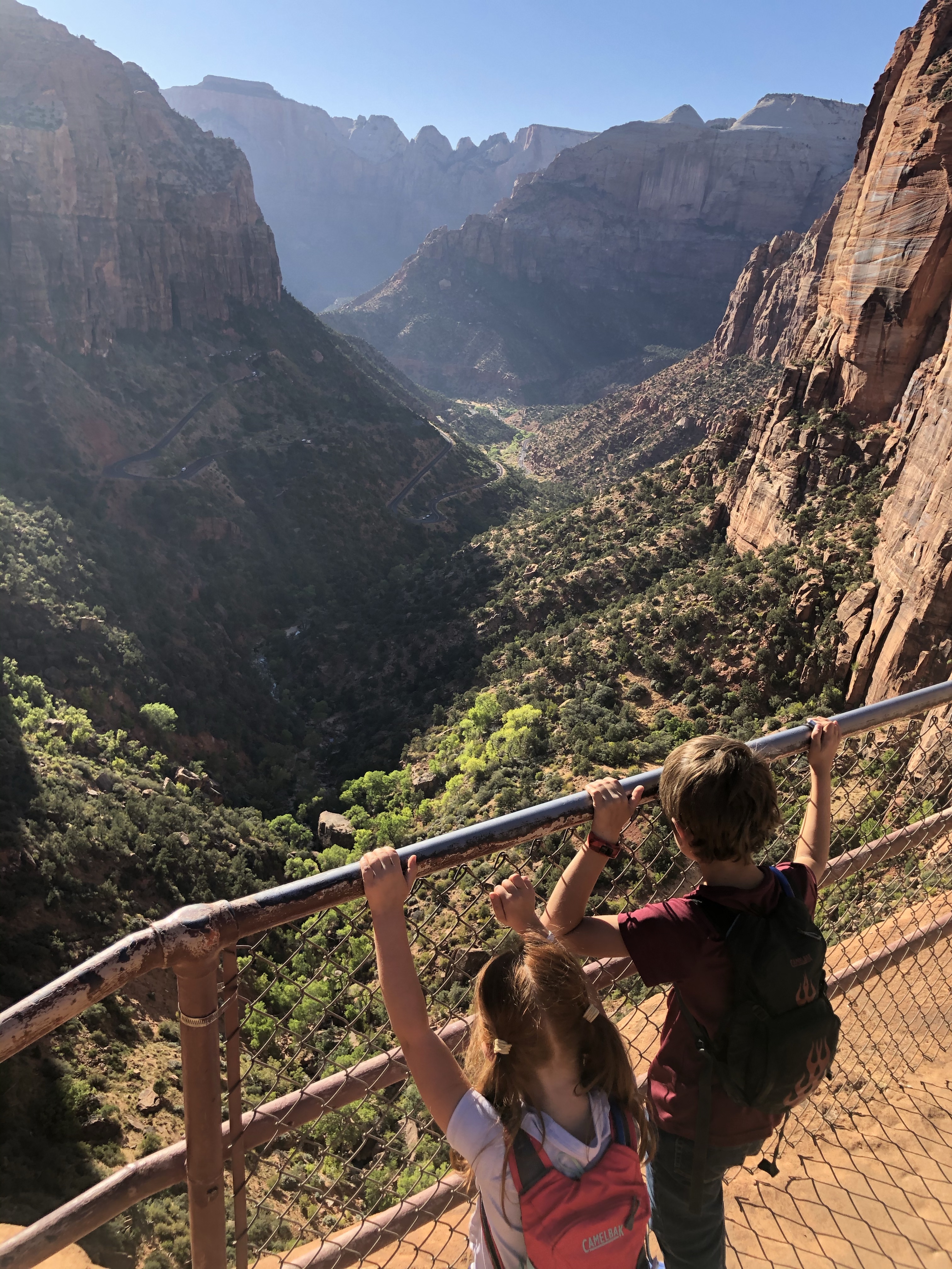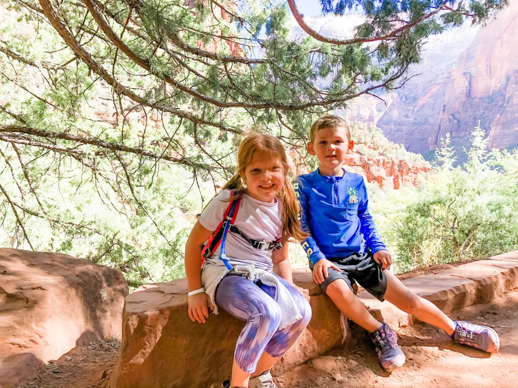 We had lunch on the lawn of the lodge. Zion is the most beautiful national park we have visited and it was also the most crowded. Jordan said it was the “Disneyland” of national parks. I think the shuttle system and the crowds caused him to make that comparison. After lunch, we ran into the gift shop (I get Christmas ornaments from places we visit. Our first ornament from vacation was one Jordan and I picked up in Carmel, CA in 2011) and then grabbed the kids some ice cream. Our kids have had more ice cream on this trip that any other period in their life. We were going to take the bus back to the Visitor’s Center and do the Pa’rus trail, but that trail is 2-3 hours and I was worried about time given that we had another 1 hour hike planned later in the day. Instead, we did a short hike called the Grotto and caught the shuttle bus to the Visitor’s Center. At this point, we grabbed our truck and took the 4 minute drive into Springdale. Springdale is awesome and I wish we could have spent more time there. The next time we come with the kids we plan to stay here. We tried to go to Zion Brewing for a quick snack, but they were closed for maintenance. So, we grabbed a quick snack at the market next door, and then headed to the Canyon Overlook. I’m always impressed by the kid’s abilities on these hikes. Canyon overlook required a lot of handholding and reminders that we weren’t getting close to the edge. I considered it practice for the Grand Canyon. This hike was strenuous, but not as strenuous as the one we did in Yellowstone. Once we descended from the Canyon Overlook trail it was 5:30 pm. We still had a 45 minute drive “home” and we were all very dirty and hungry. We made the decision to grab food on our way home instead of cooking. After a quick search we found a pizza place nearby and thought “this will be great!” Unfortunately, it took over 30 minutes to make the pizzas so we probably could have gone home and eaten more quickly. While we were waiting, the man behind the counter asked what we had done in Zion. When we told him “Riverside Walk, Lower Emerald Pool, Grotto, and the Canyon Overlook” he said “all today?! No wonder y’all are so hungry!” According to the kids watches Hudson took almost 22,000 steps and Lucy took almost 24,000. I had climbed over 90 flights. It was a very full day, but we didn’t even see half of what we would have liked to in Zion hence the planning to come back for several days when the kids are older