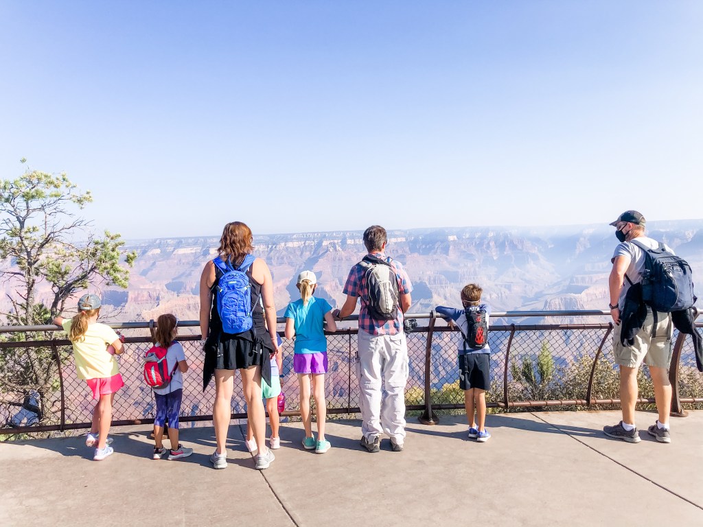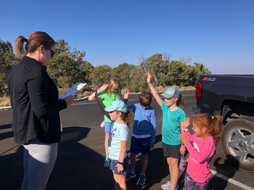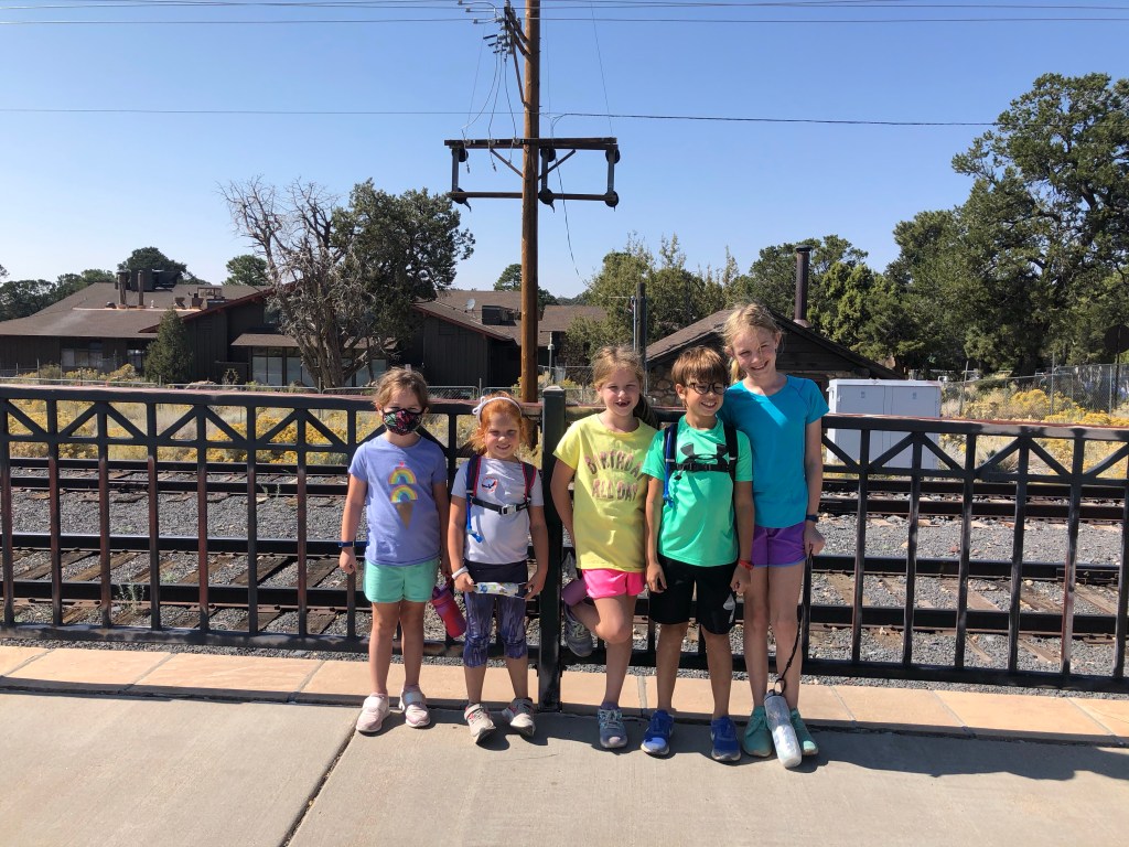 We started the day again at the same time, 7:30 am, and we were aiming to get home a little earlier so our kids could have some downtime. Today, we planned to head east to the Desert Watchtower. Well, we got about 2 miles from the Desert Watchtower before the road shut down. At a lookout point, I called and a ranger told me that the watchtower was closed due to Covid. We were all pretty bummed. We hit a few other lookout points and the adults looked while the kids played “the floor is lava” on the rocks. Ashley had mentioned the Shoshone point hike when we were talking about taking this tirp together and I mentioned that to them while we were trying to figure out how we were going to fill our day. We looked it up and it was close by. The Shoshone trailhead is really just a parking lot. You walk about a mile in a pine forest before you reach Shoshone point. This point has a pavilion and you can even reserve to have weddings there. There were tons of picnic benches and we had brought our lunch. It turned out to be the perfect hike to the perfect spot for our last day at the Grand Canyon. On our way there, the kids were all in search of hiking sticks. Courtney, the youngest, had the largest hiking stick, but she made it work! After lunch, the kids played nearby while the adults enjoyed each other’s company looking out at the canyon. I don’t think it could have worked out better if we had actually planned it. As we packed up lunch, each of the kids took a last look at the Grand Canyon before we made the hour trip “home.” We arrived about 2 pm. Jordan and the kids zoned out while I did a few things for PTO, and planned our trip back home. We were going to stay in Williams all week, but decided to start making our way to Texas on Wednesday. At 5 pm, we met the Weavers at Grand Canyon Brewing and Distillery. The kids had a table right next to us and they were so good while we ate. I’m so glad Hudson is finally old enough for those word searches they put on kids menus! Since the Weavers lived in Indonesia up until about six months ago, it was fun hearing them talk about expat life. I’m sure the particulars may be different given we will be in different countries, but their perspective on how to approach life overseas was really great to hear. I haven’t thought too much about Angola in the past few months and these conversations reminded me“oh yeah… eventually we are moving overseas. That’s going to be so cool!”