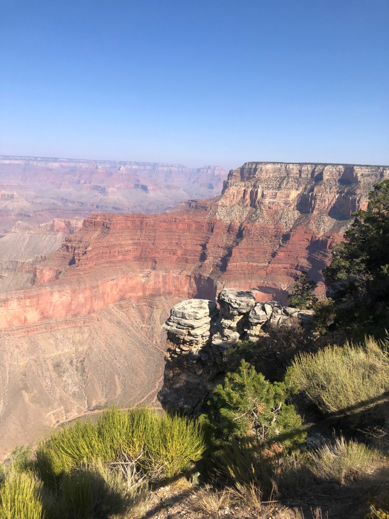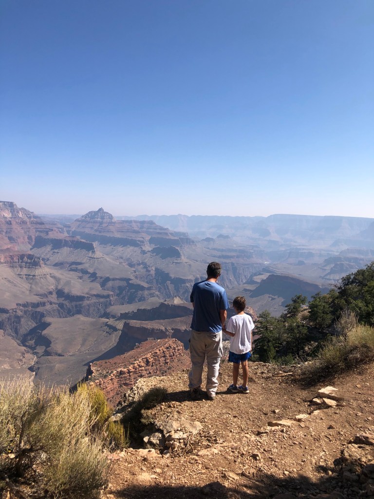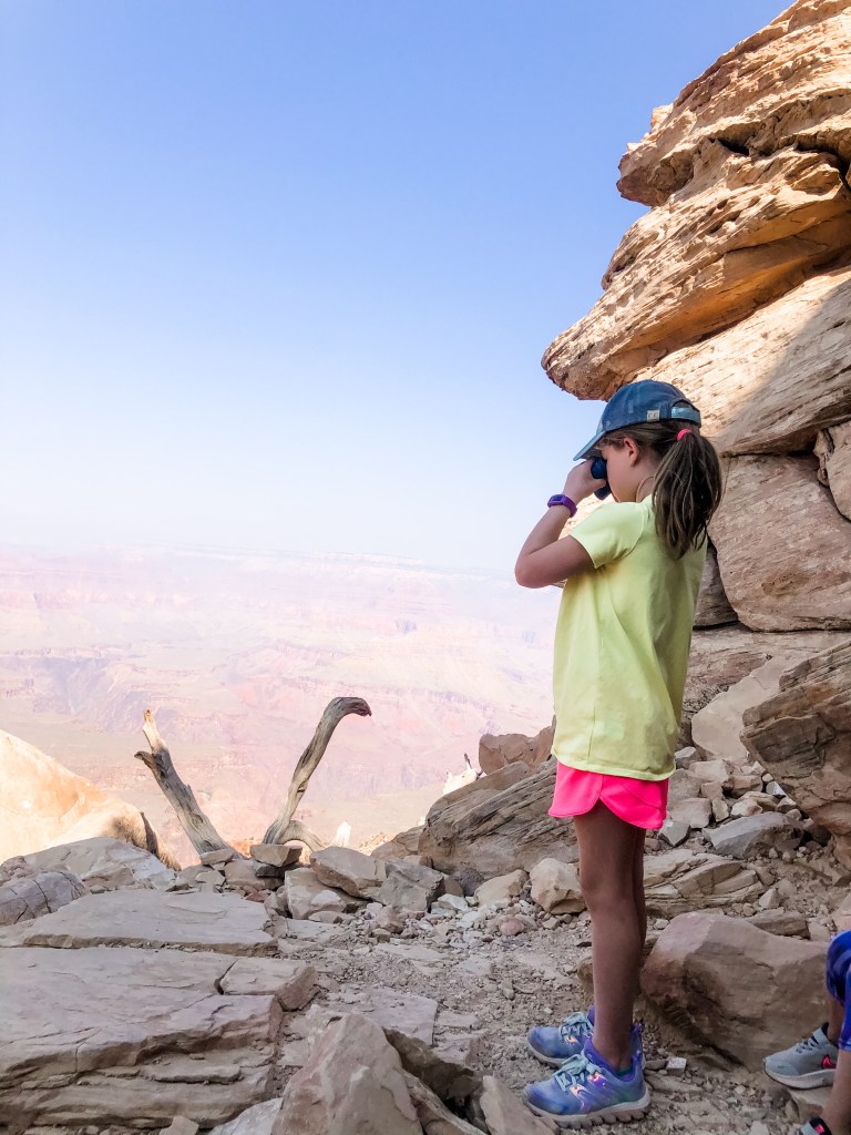 After lunch, we boarded the shuttle that took us out to Hermit’s Rest and then stopped at Mohave and Powell Point on way back to the car. Hermit’s Rest was designed by a female architect, Mary Coulter, in the early 1900s. I can’t imagine there were a lot of female architects at that time and this fact made an impression on me. At this point in the day, I think the kids were like, “yep, I see the canyon, can we run and play?” Some view points has some space that allowed them to run and play and others I felt like one wrong jump and they would be down about 200 feet. Hudson assessed that death was only a 50/50 chance and seemed ok with those odds. The adults were not.