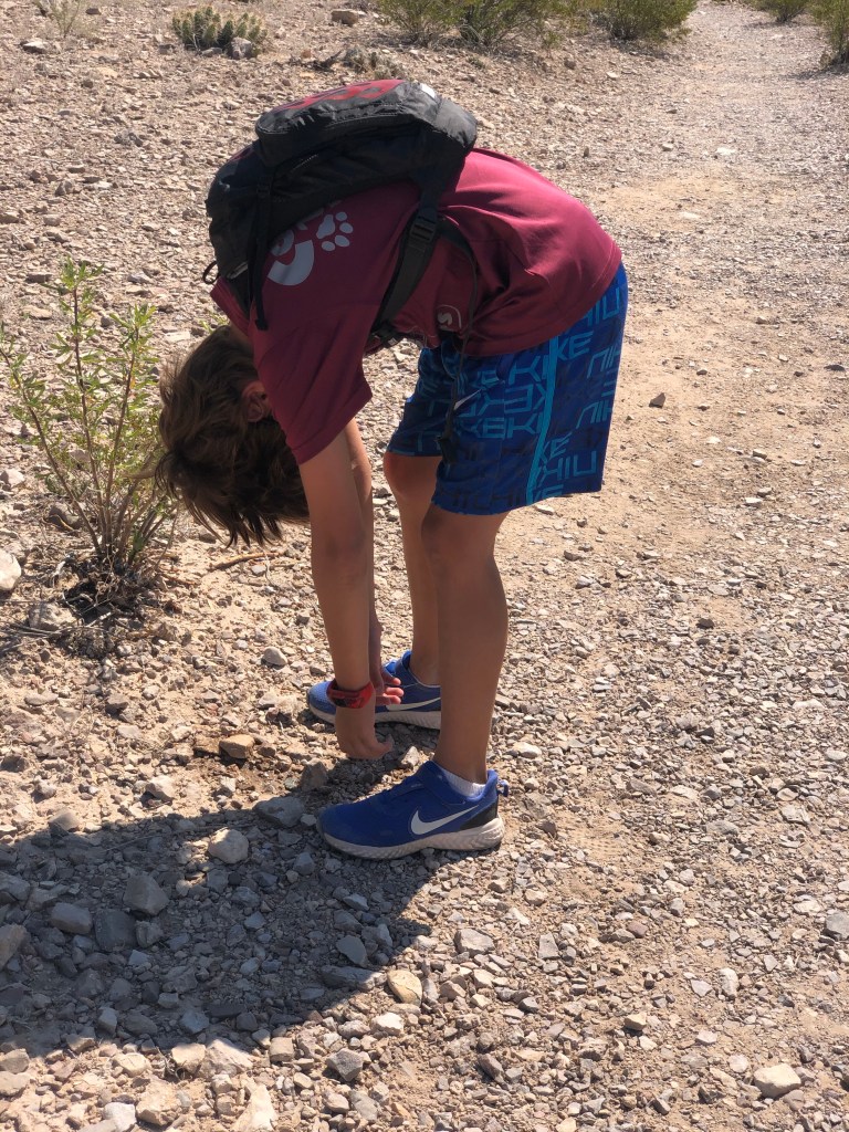 We were hoping to start our day early today, but when we hooked up at the Stillwell Park and RV Store we noticed that our refrigerator was flashing “LP” which means low propane. Propane is important because it actually keeps our fridge running, our stove working, and our grill grilling. Since we were low we needed to get some sooner rather than later. Well, twenty minutes north of Big Bed is not the best place to try and find propane. Jordan left to go hunt some down and ended up driving 1.5 hours before he found some in Alpine, Texas. He didn’t get home until about 11:30 so the kids and I had a slow morning around the RV. Once he got back, we loaded up in the truck and headed in to Big Bend. Our first stop was some picnic tables near Dugout Wells. Since the kids and I had a late breakfast we weren’t hungry so Jordan was the only one who ate. The rest of us just swatted flies away. At one point, a bug bit me and it hurt pretty badly. I looked around and all I saw were flies so I assumed it was something else.