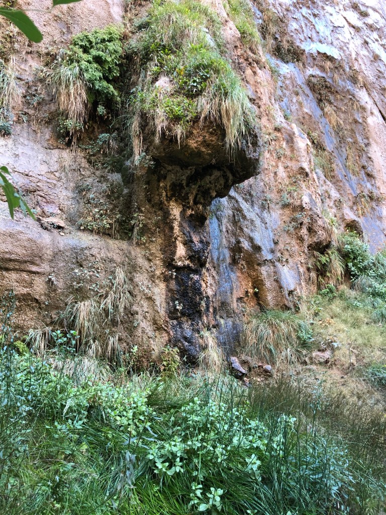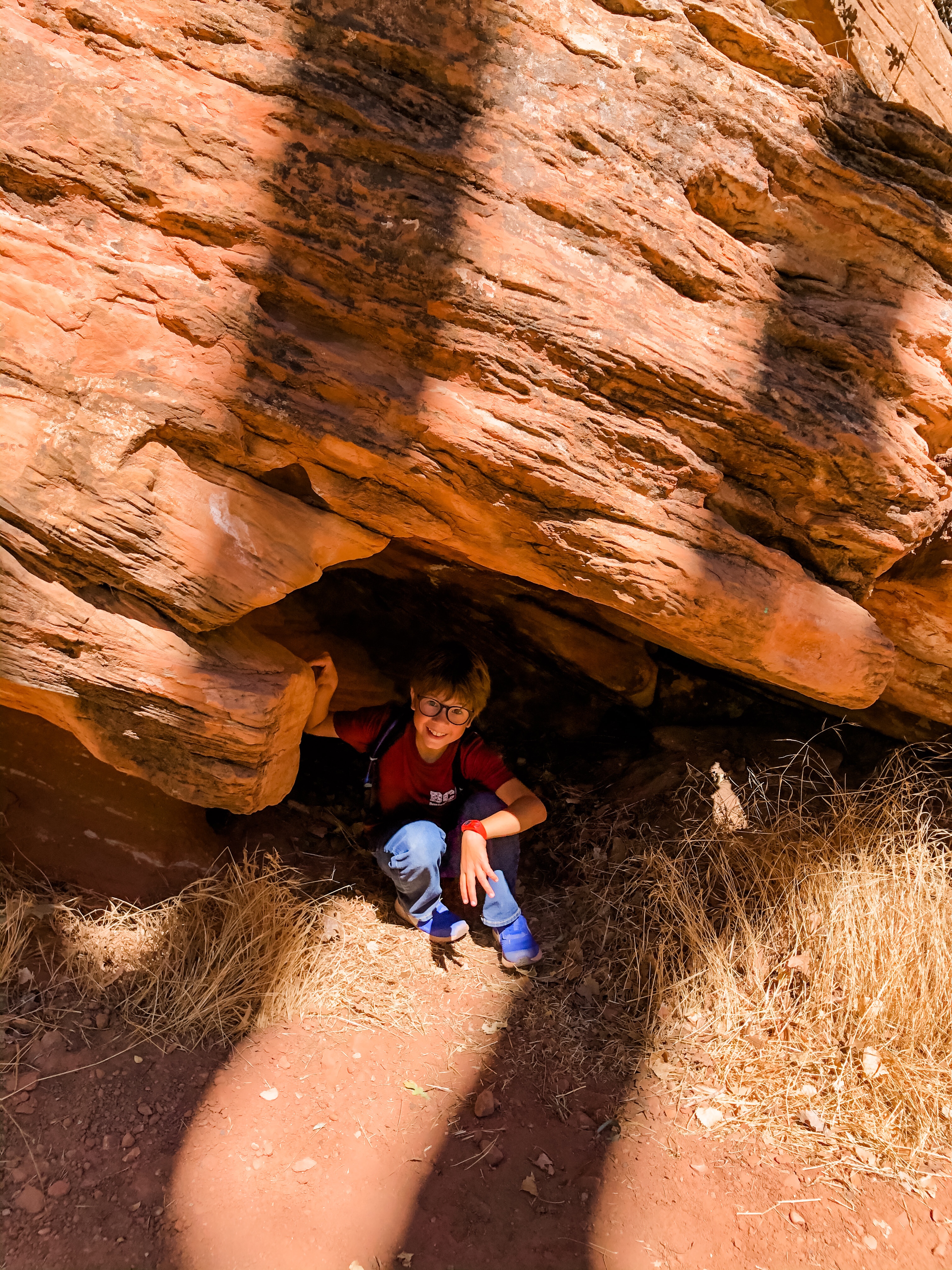 After the riverside walk, we got back on the shuttle to head towards the lodge and do the lower emerald pool hike. As we were walking across the lawn of the lodge to the trailhead, a little boy came running over saying, “Lucy! Lucy!” He had a baseball cap and mask on so I couldn’t place him. My first thought was, “is a kid from her preschool here?” and so I asked him his name. He replied, “Jack!” like I should have known. When I looked behind Jack, I saw our “neighbors” from the park in Heber City, UT (the guy I went to HS with and his family) standing right there. I can’t believe we ran into them again! In all of Zion, to be at the same place at the same time was such a crazy coincidence. The kids were elated! I told Jordan later that either we are meant to be friends with these people or they are going to get a restraining order against us thinking we are stalking them. They were planning on doing the upper emerald pool hike so we hiked together for a while before we turned back to eat lunch. The lower emerald pool hike takes you behind a waterfall. The waterfall wasn’t particularly heavy as the park ranger said they have had about “five minutes of rain since April,” but it was still a magnificent sight to see.